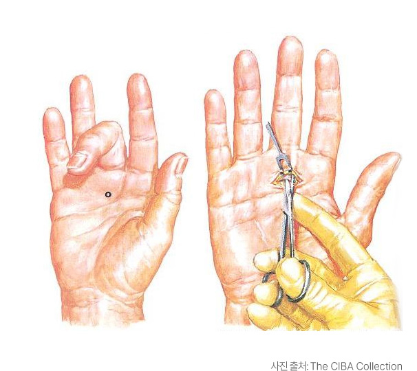 손바닥에 1cm 정도 절개 후 힘줄이 지나는 통로에 터널 모양의 막을 세로로 잘라